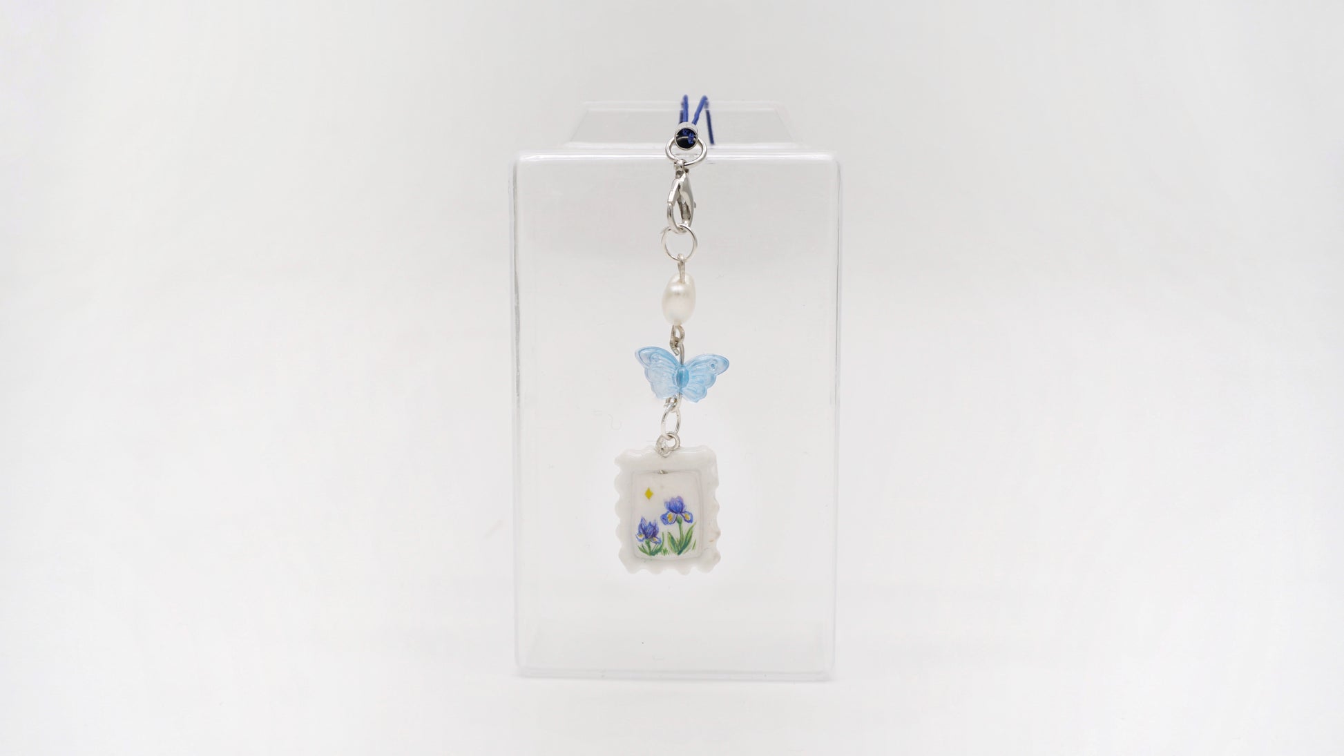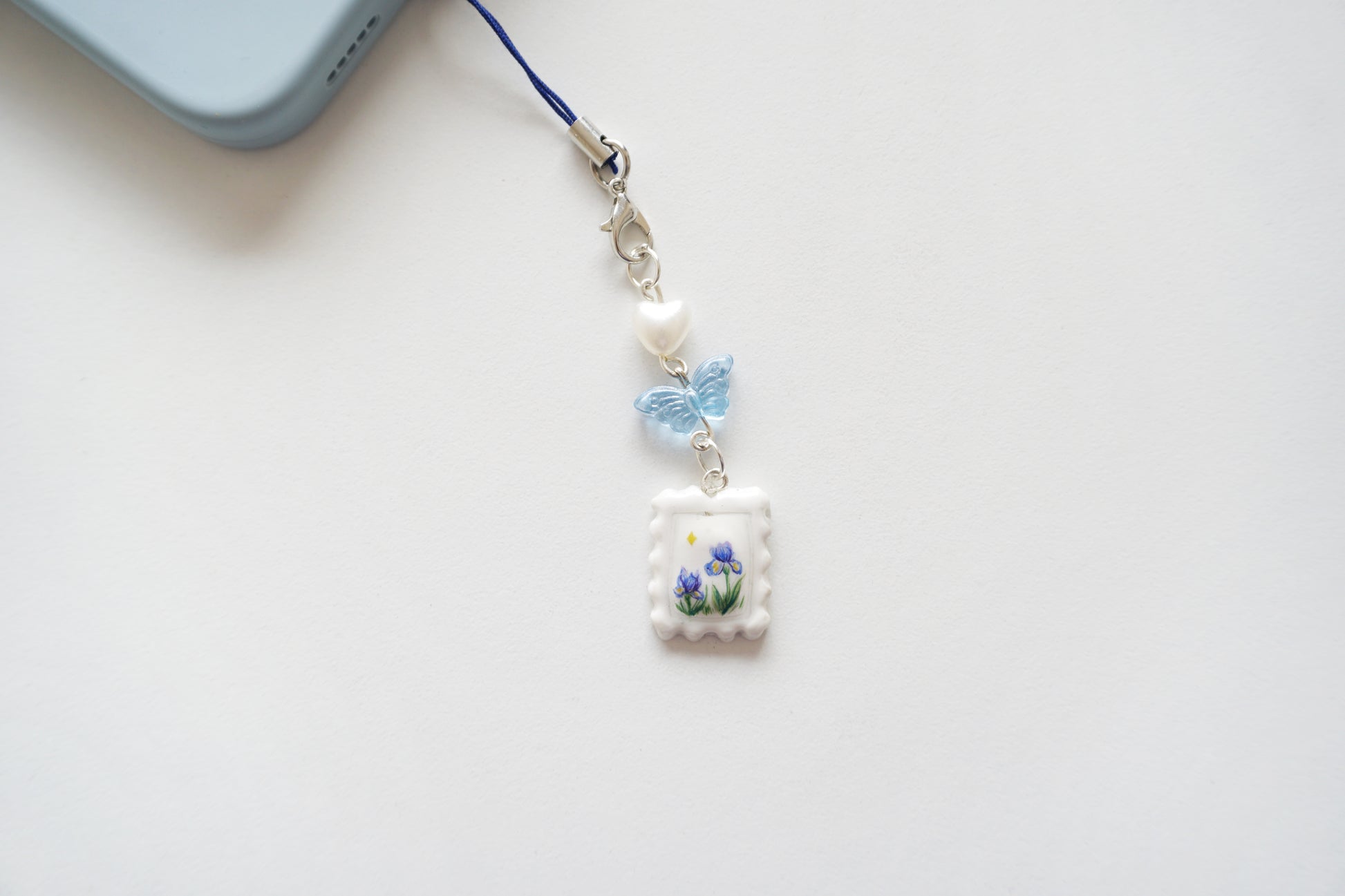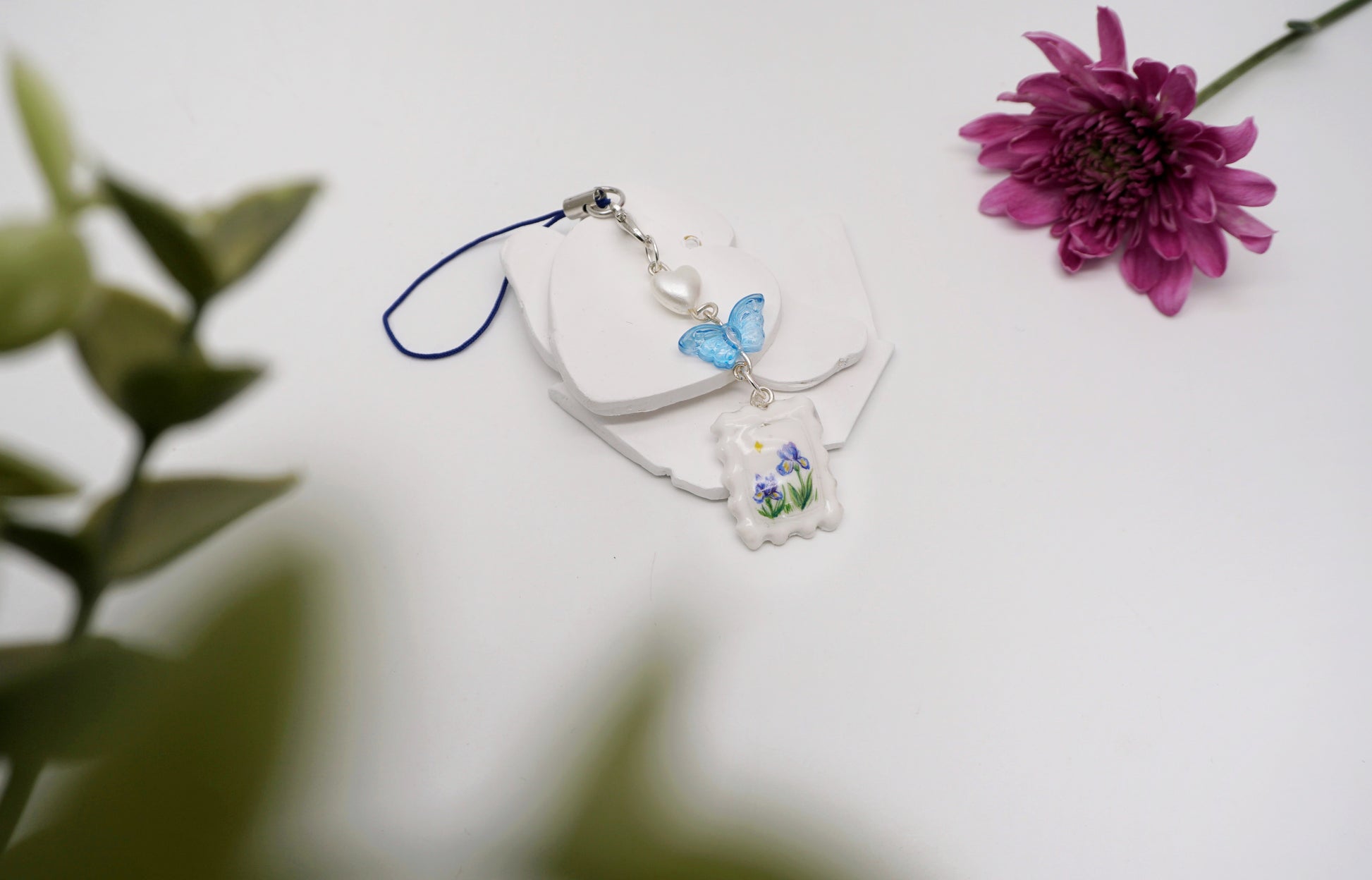 A handcrafted clay charm featuring a delicate blue iris in bloom. Lightweight, durable, and perfect for adding a floral touch to your phone or bag!