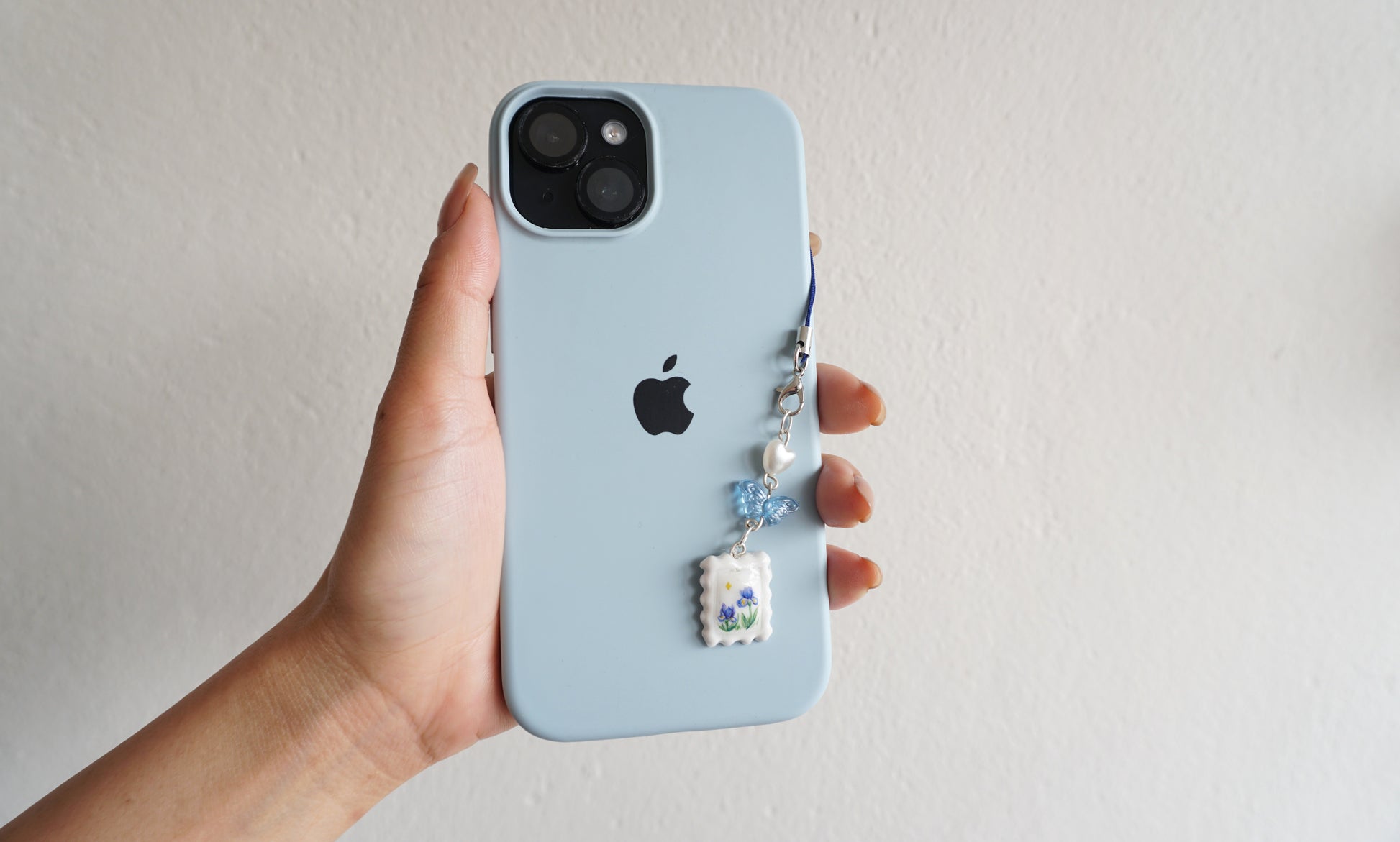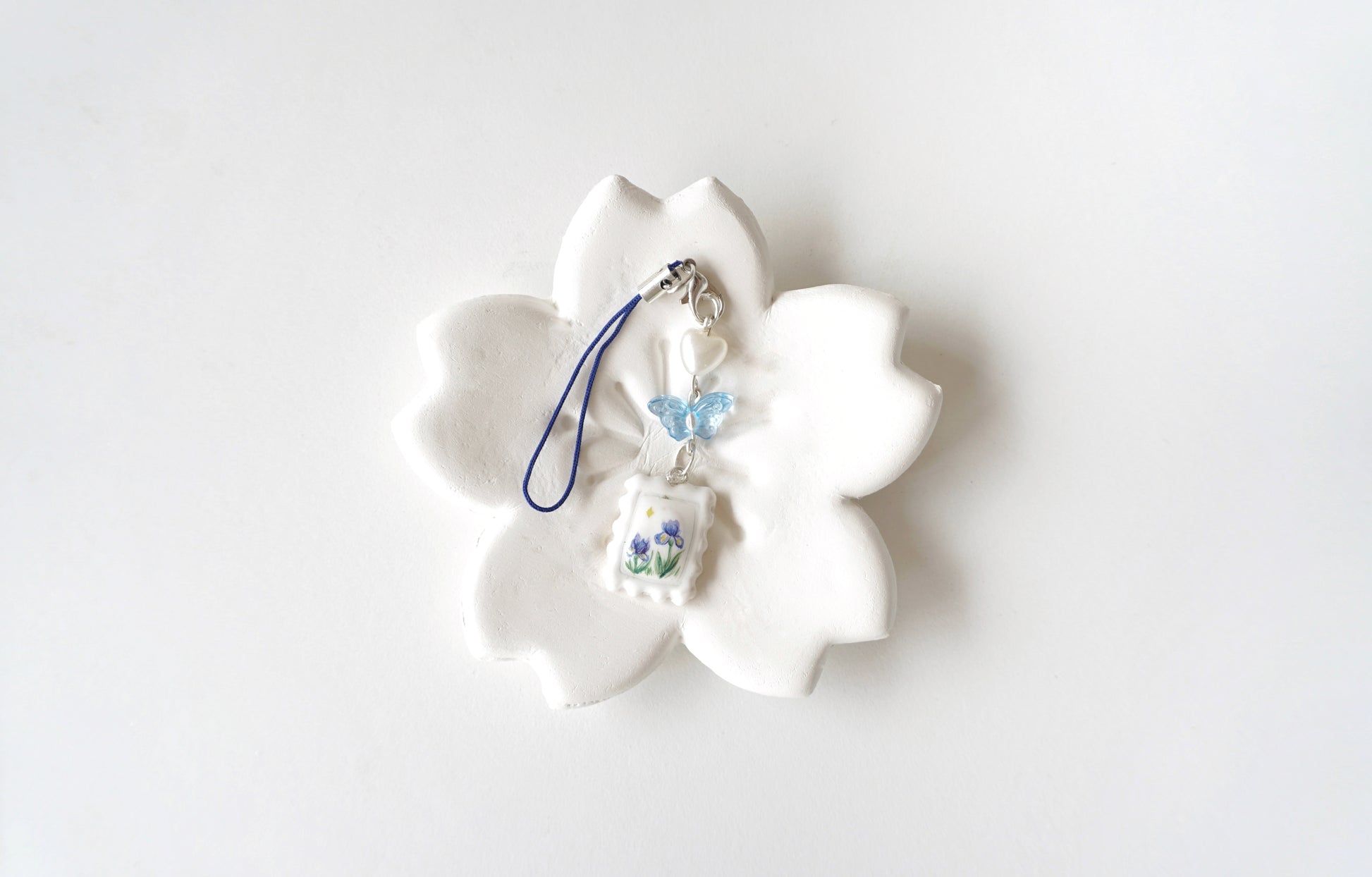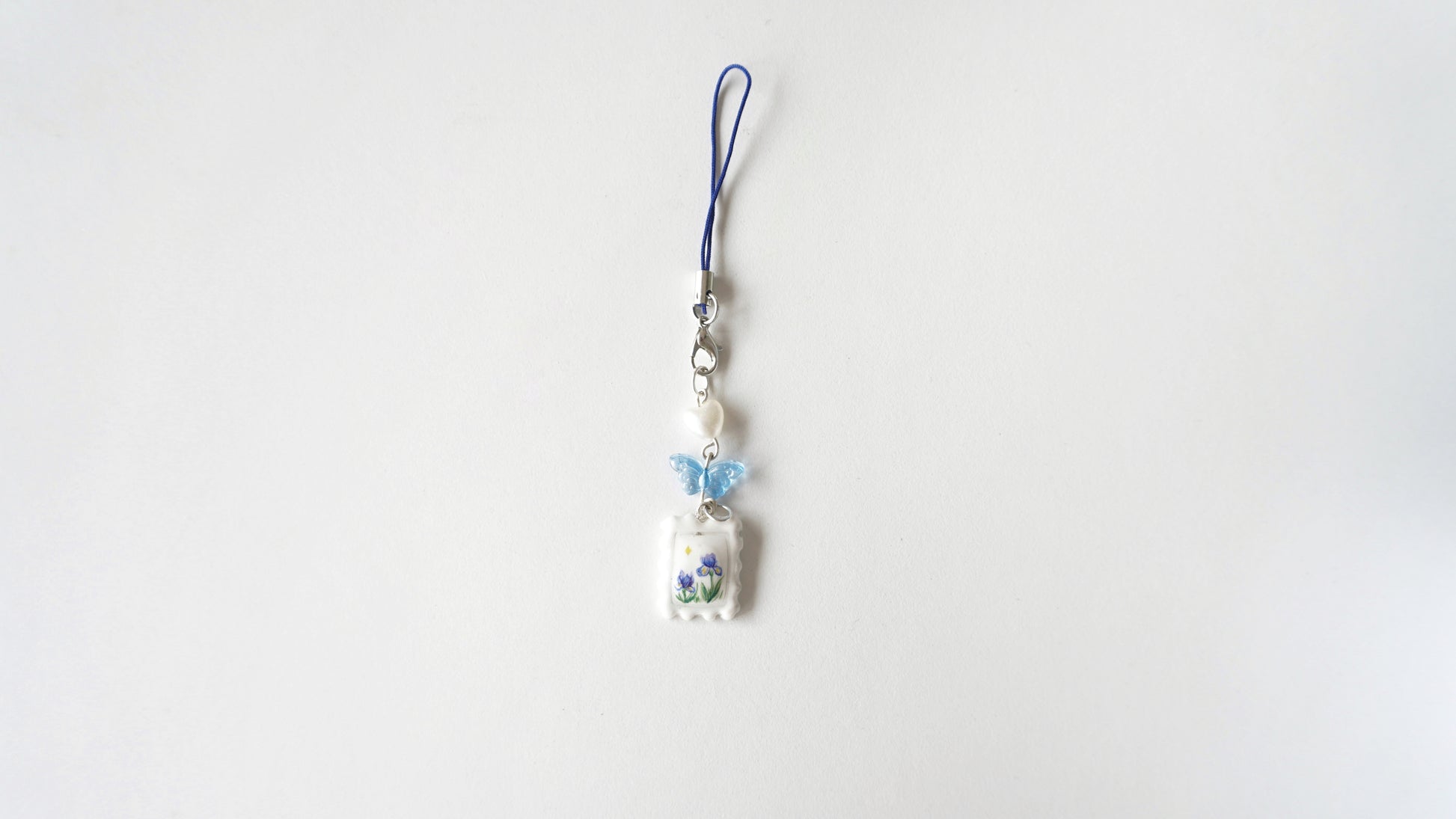 A handcrafted clay charm featuring a delicate blue iris in bloom. Lightweight, durable, and perfect for adding a floral touch to your phone or bag!