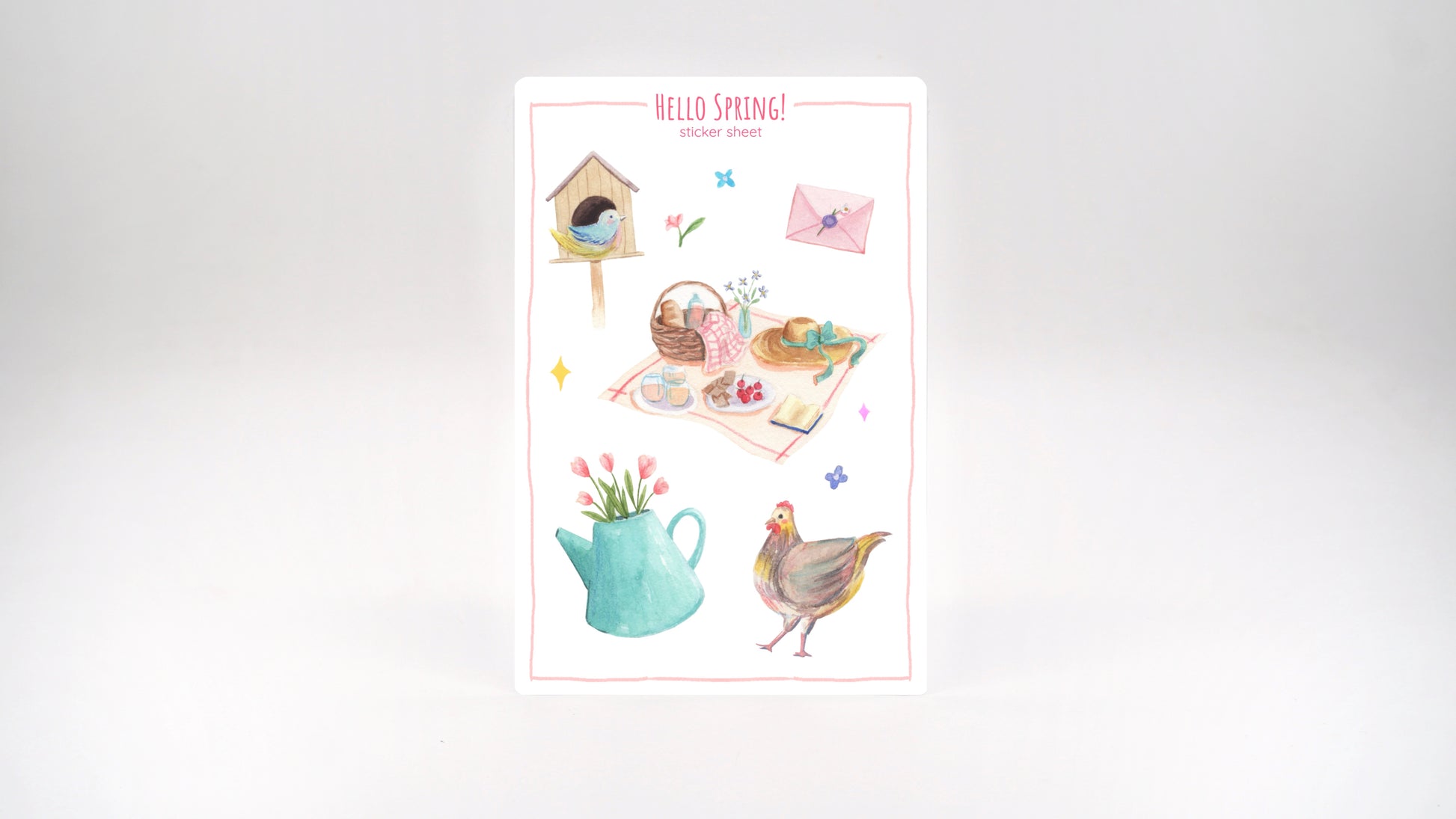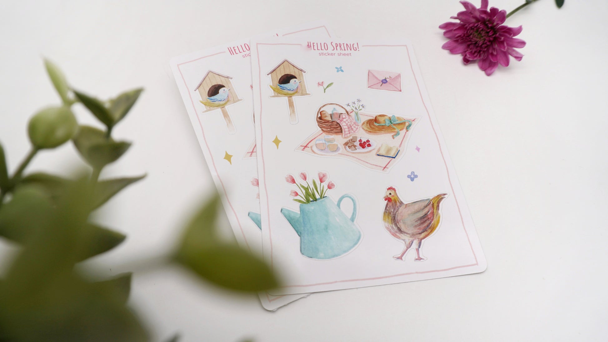 Celebrate the season with this spring-inspired sticker sheet, perfect for journals, planners, and scrapbooks! Featuring whimsical illustrations of envelopes, birds, a hen, tulips in a bucket, and a cozy picnic—each sticker adds a touch of charm and nostalgia to your pages.